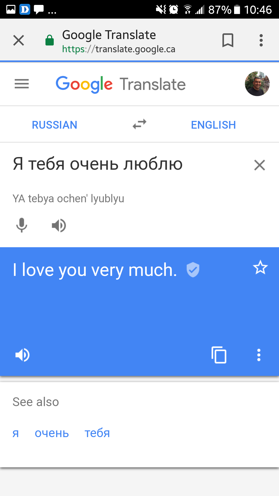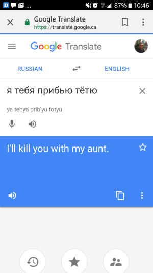 I was explaining to kiddo the other day that I used to study other languages back in university and after I answered her expected question as to which ones I had studied, she shot me a quizzical look – you know, the “yeah right” look. So, I thought that we could play a little game. I fired up Google Translate on my phone and set the input language to Russian and the output language to English. I then started a pattern: I would tell her an English phrase that I was going to speak in Russian, I would speak it into the app, and then she would see that the English translation was what I said it would be.