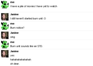 A few of my friends and I will (occasionally) take a perfectly innocent phrase in one of our conversations and turn it on it’s ear with some good ol’ innuendo (in YOU end oh). The following convo was with a friend of mine, to whom I loaned the season 1 DVD set of Burn Notice…